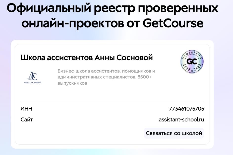 Мы получили Знак качества GetCourse и теперь официально входим в реестр проверенных и добросовестных онлайн-школ платформы. Это знак доверия, который получают только школы с выстроенными процессами, прозрачным сервисом и стабильным качеством обучения.
